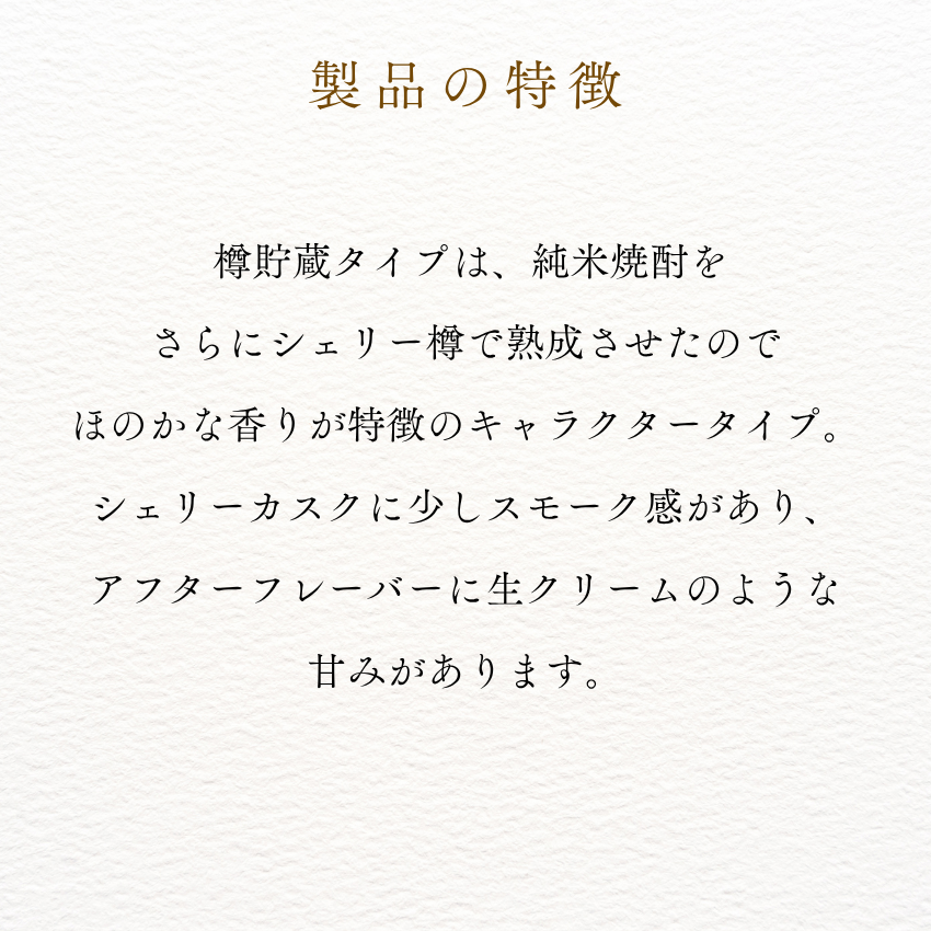 樽貯蔵は、純米焼酎をさらにシェリー樽で熟成させたので、ほのかな香りが特徴のキャラクタータイプ。シェリーカスクに少しスモーク感があり、アフターフレーバーに生クリームのような甘みがあります。