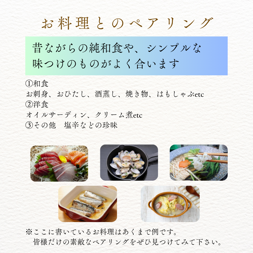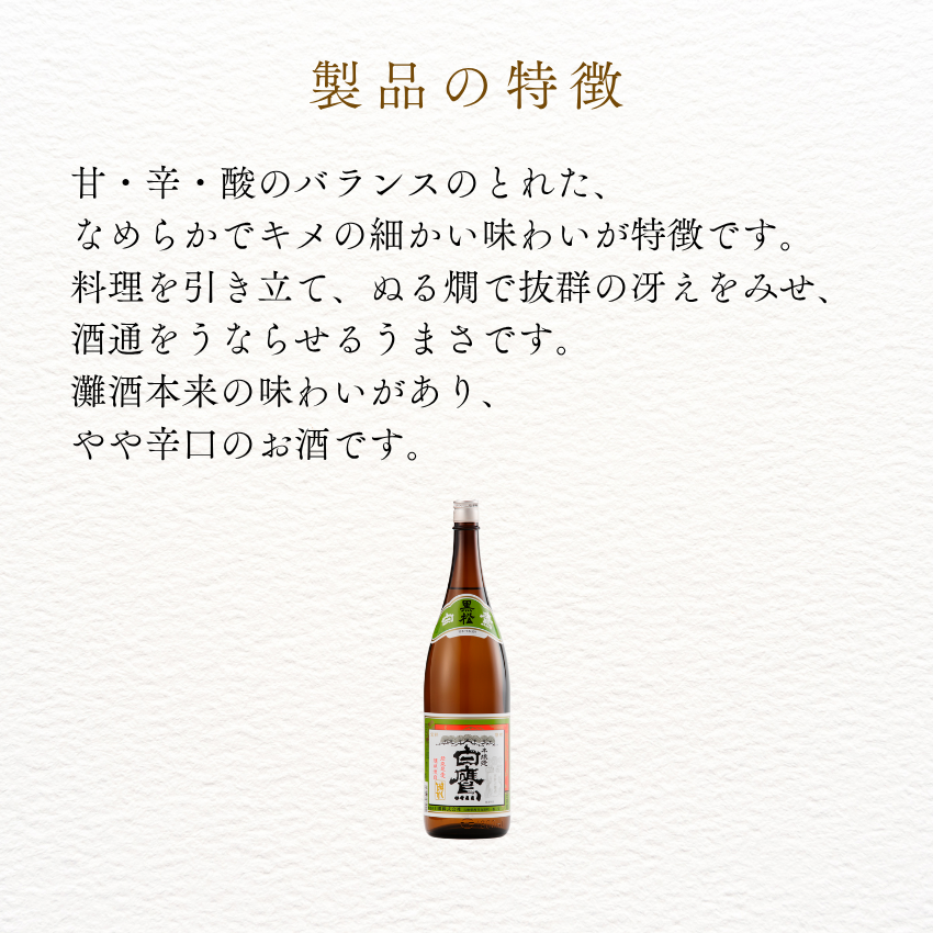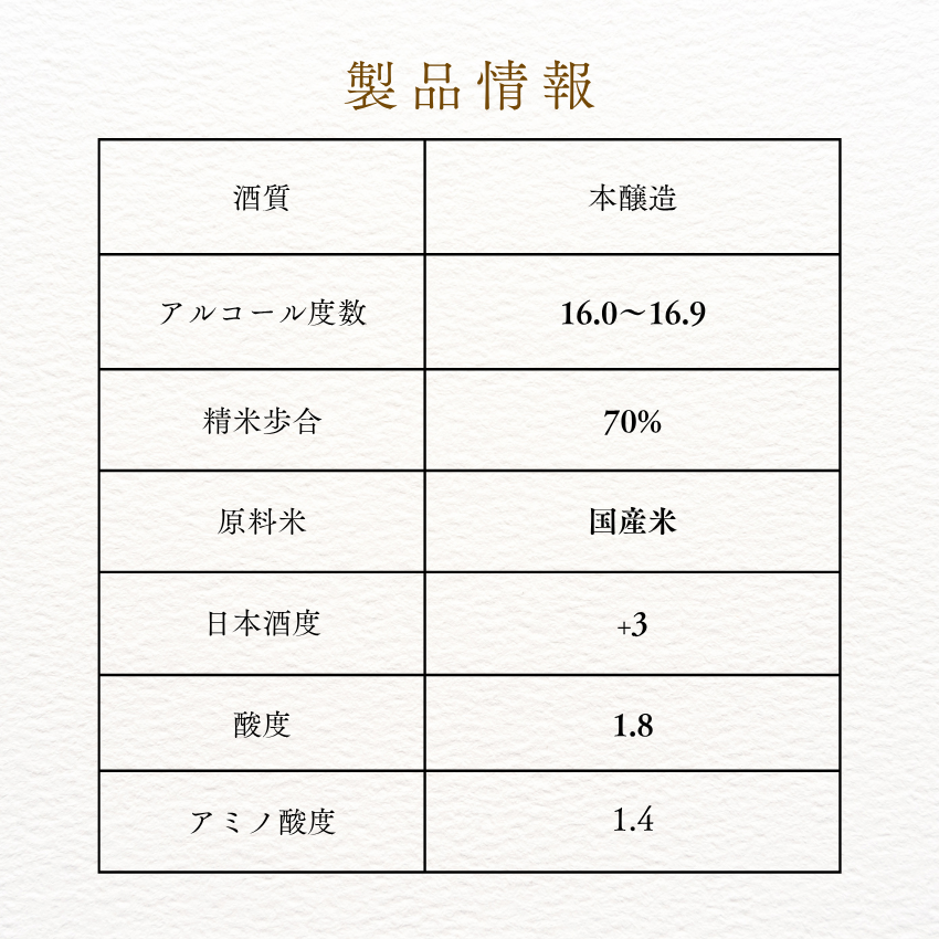 甘・辛・酸のバランスのとれたなめらかでキメの細かい味わい。料理を引き立て、ぬる燗で抜群の冴えをみせ、酒通をうならせる旨さです。 <化粧箱入>
