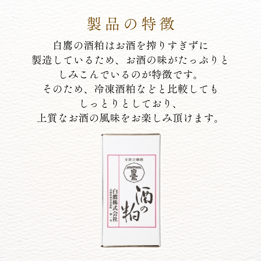 白鷹の酒粕はお酒を搾りすぎずに製造しているため、お酒の味がたっぷりとしみこんでいるのが特徴です。